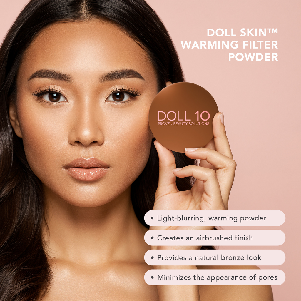 The Doll Skin™ Warming Filter Powder is an ultra-blurring, weightless warming powder that creates an airbrushed finish while providing a natural looking bronze. This silky, loose powder is fortified with Vitamin C, Matcha Extract, Peptides, Hyaluronic Acid & Niacinamide to temporarily help hydrate, smooth and warm skin’s appearance.