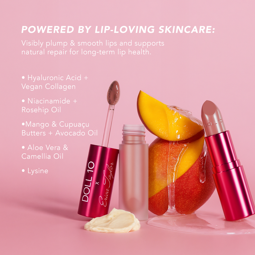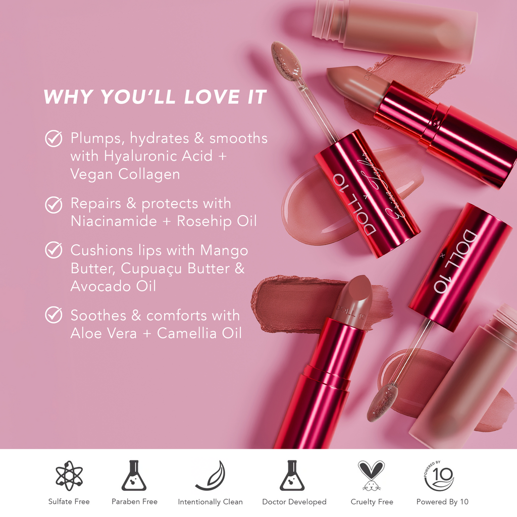 Our clean, skincare-powered formula is infused with a powerhouse blend of ingredients including hyaluronic acid, mango butter, vegan collagen, niacinamide, rosehip oil, avocado oil, aloe vera, camellia oil, lysine, and cupuaçu butter to plump, smooth, and repair your lips with every swipe.