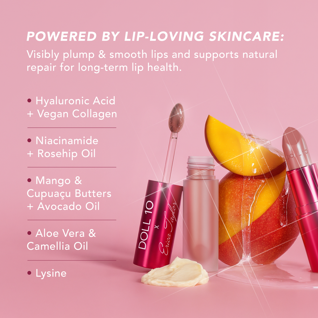 Our clean, skincare-powered formula is infused with a powerhouse blend of ingredients including hyaluronic acid, mango butter, vegan collagen, niacinamide, rosehip oil, avocado oil, aloe vera, camellia oil, lysine, and cupuaçu butter to plump, smooth, and repair your lips with every swipe.