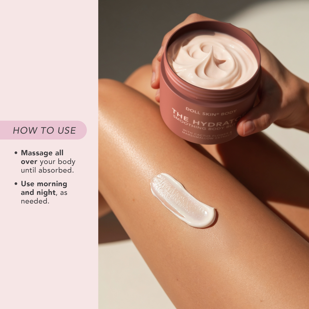 The Hydrator Body Butter: Massage generously onto skin, focusing on dry areas. Use AM & PM for best results.